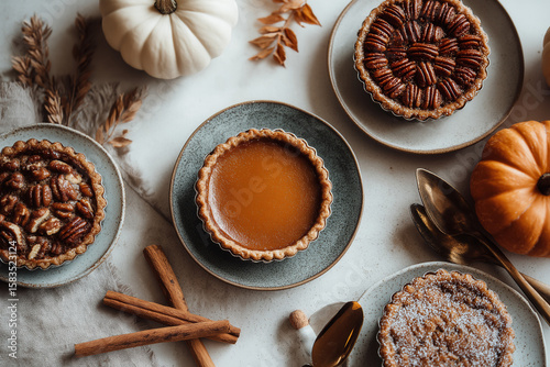 autumn desserts: individual pumpkin pies, pecan tartlets, and cinnamon sticks on light backdrop