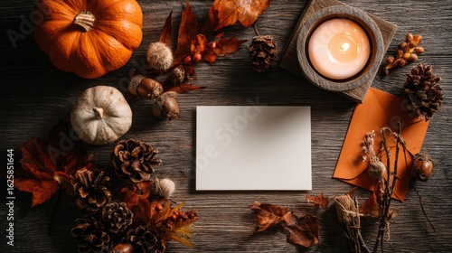 autumn flat lay composition with candlelight, blank white card on rustic wooden table, fall leaves, pinecones, small pumpkins, dried twigs and orange envelope, cozy and moody lighting