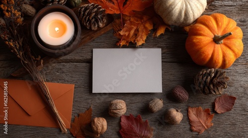autumn flat lay composition with candlelight, blank white card on rustic wooden table, fall leaves, pinecones, small pumpkins, dried twigs and orange envelope, cozy and moody lighting