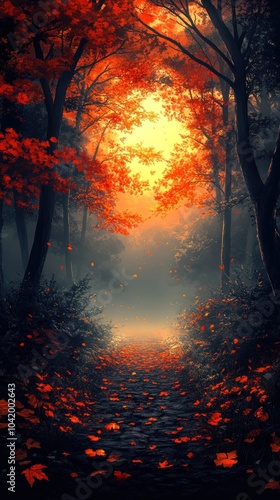 autumn, forest, path, leaf, tree, fall, nature, landscape, timberland, season, red, orange, yellow, green, brown, digital artwork, illustration, artwork, scenery, misty, pathway, sunlight, dreamy, magical, colourful, vibrant, serene, peaceful, beauty, mood, ambience, foliage, gold, sunset, light, soft, abstract, relaxing, travel, photo, scenic, photo, fall foliage, autumn, wood, natural beauty