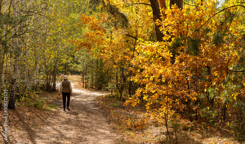 Autumn forest. The path meanders among the trees. Good weather. Nice walk. Beautiful autumn colors.