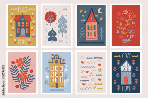 Autumn greeting cards with houses, fir trees, flowers, leaves, tulips