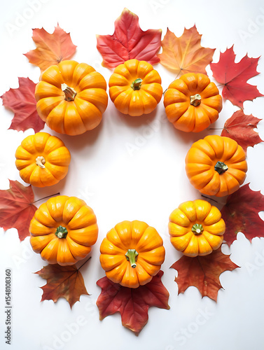 Autumn Harvest Frame: Pumpkins and Fall Leaves on a White Background