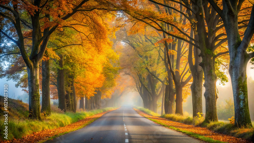 road, autumn, forest, fall, tree, tree, nature, landscape, leaf, season, path, yellow, sky, travel, park, leaf, wood, rural, foliage, fog, street, country, green, colourful, foggy