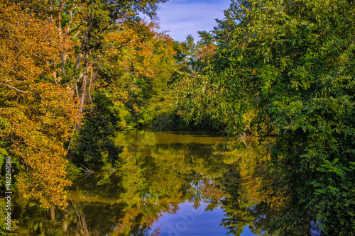 autumn, lake, water, landscape, nature, tree, forest, tree, river, fall, park, sky, yellow, duck pond, green, leaf, blue, leaf, orange, foliage, beautiful, season, colours, red