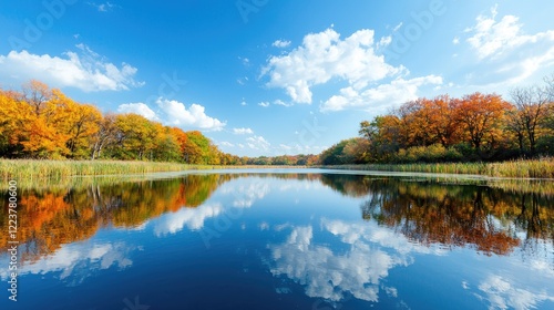 Autumn lake reflection, colorful trees, sunny sky, peaceful nature scene, ideal for calendars