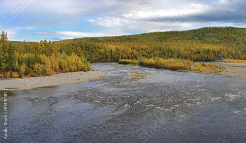 river, autumn, mountain, nature, landscape, travel, scene, water, horizontal, colours, bend, rock, coloured, beauty, sky, sunlight, tree, day, yellow, deciduous, formation, cloud, leaf, blue, pebble, shore, riverbed, rapid, september, season, weather