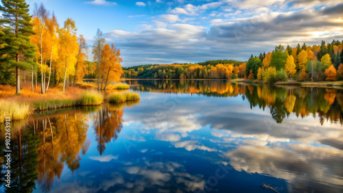 Autumn landscape with a serene lake in Scandinavia , fall, Nordic, foliage, peaceful, reflection, water, trees