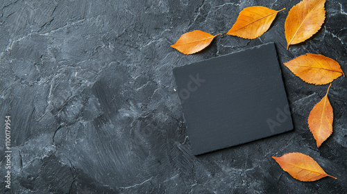 Autumn leaves on dark stone background with blank slate for text or design. Rustic fall scene.