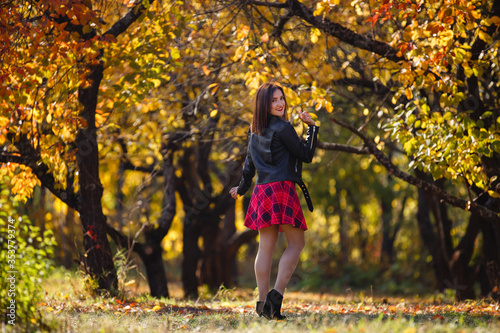 Autumn mood. Romantic woman weared in black jacket & red checkered dress with red scarf walking in a park on background of beautifull autumn leaves. Smile. fall coming. Autumn story. Brown-haired girl