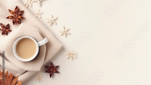Autumn or winter composition. Gift box Coffee cup, cinnamon sticks, anise stars, beige sweater with knitted blanket on cream color gray fluffy background with generative ai