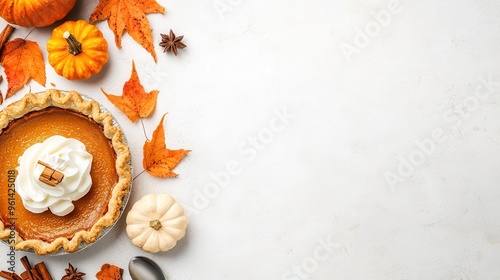 background, food, holiday, homemade, cream, pie, blank, colours, top, overhead, pumpkin, treat, pastry, leaf, photo, cinnamon, space, sweet, bakery, maple, table, decor, seasonal, star, copy, view, anise, styling, delicious, thanksgiving, dessert, white, autumn, whipped