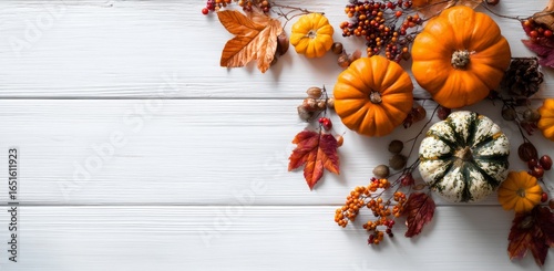 Autumn Pumpkins and Fall Leaves Arrangement on White Wooden Surface