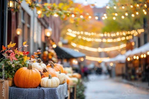 Autumn pumpkins and festive lights in a vibrant fall setting