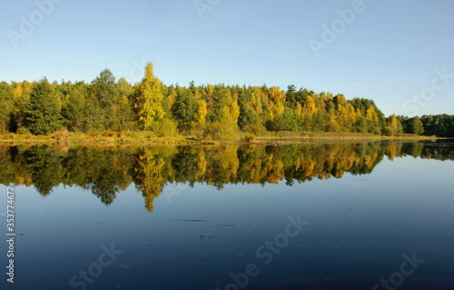 Autumn trees are reflected in the water of a forest lake on a Sunny morning. Moscow region. Russia.
