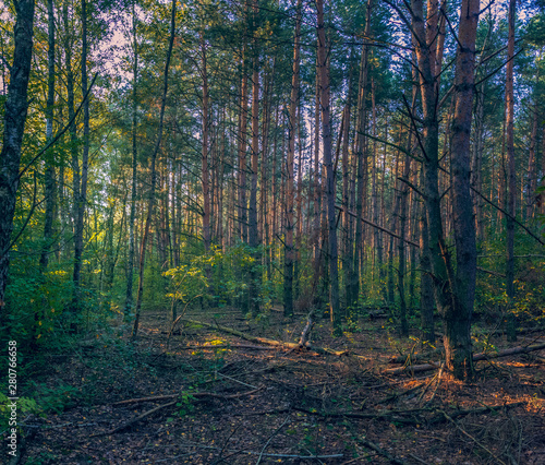wood, forest, autumn, fall, faded, nature, landscape, morning, dawn, fog, water, dew, mist, leaf, tree, pine, fir