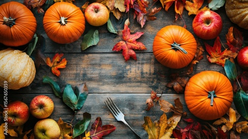 Autumnal display of pumpkins, apples, and leaves on a rustic wooden surface.