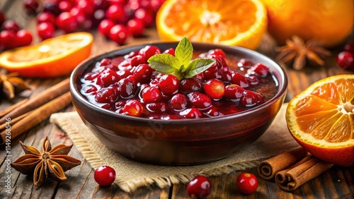 Autumnal food photography: close-up of glistening cranberry sauce with cinnamon and orange zest.