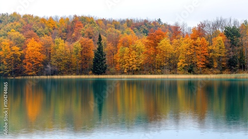 Autumnal lake reflecting colorful trees.