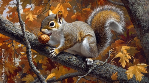 squirrel, autumn, leaf, nut, tree, tree branch, wildlife, nature, fall, forest, animal, mammal, rodent, artwork, painting, art, colours, detail, realistic, closeup, image, photo, scene, timberland, bushy, tail, furry, brown, grey, orange, yellow, gold, red, crisp, vibrant, masterpiece, artistic, illustration, natural, flora, fauna