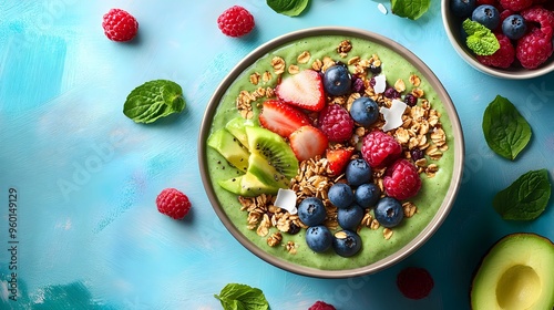 avocado, smoothie, bowl, berry, granola, fruit, healthy, food, breakfast, nourishment, diet, vegan, vegetarian, lifestyle, green, fresh, natural, organic, delicious, tasty, alimentary, snack, meal, energy, wellness, well-being, mindful, balanced, clean, wholesome, antioxidant, vitamin, mineral, fiber, metabolism, immune, promoting, nourish, indulge, delight, savour, enjoy, photograph, image, photo