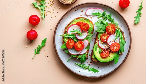 avocado, toast, radish, cherry, tomatoes, healthy, fresh, meal, arugula, plate, seed, dish, food, snack, breakfast, brunch, lunch, cookery, vegetarian, vegan, colourful, vibrant, alimentary, greener, sliced, epicure, whole grain, bread, kitchen, table, organic, slice, raw, garnish, diet, nourishment, culinary, hand-made, delicious, cooking, basil, round, appetising, crunchy, herb, salad, refreshing