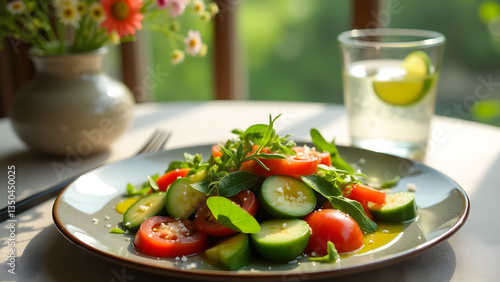 tomatoes, cucumber, olive oil, sea salt, wildflower, sparkling water, refreshing, vibrant, seasonal, healthy, spring balance, spring flower