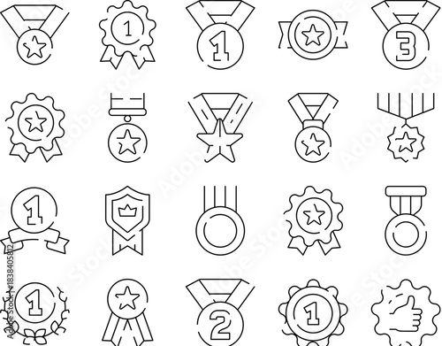 award, medal, achievement, success, winner, recognition, champion, victory, prize, first, place, reward, competition, celebration, excellence, quality, best, rating, ranking, accomplishment, triumph, honour, prestige, emblem, badge, ribbon, star, number, gold, silver, bronze, laurel, chaplet, crown, shield, icon, set, collection, line, art, vector, symbol, graphic, outline, minimalistic, pixel, honed, simple, modern, pictogram