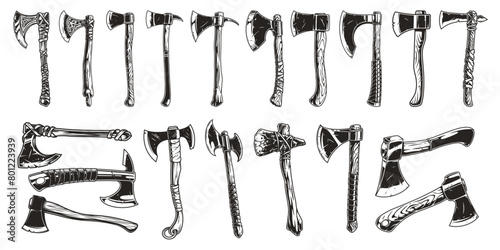 axe, sharp, tool, carpenter's shop, logging, blade, instrument, wood, old, building, house, weapon, hatchet, tough, trunk, carpenter's shop, conflict, barbarian, wooden, war, vector, illustration, logotype, logotype, vintage, retro, emblem, pin, symbol, badge, sticker, element, shirt, apparel, template, poster, flier, t-shirt, solid, monochrome, black, white, set, collection, bundle