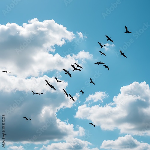 bird, flock, flying, sky, cloud, blue, white, nature, wildlife, avian, flight, fly up, freedom, wing, air, movement, sunshine, cloudscape, atmosphere, high, altitude, outdoors, scene, image, view, perspective