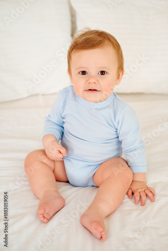 Baby close-up portrait, smiling and joyful little child on a white bed in a blue bodysuit