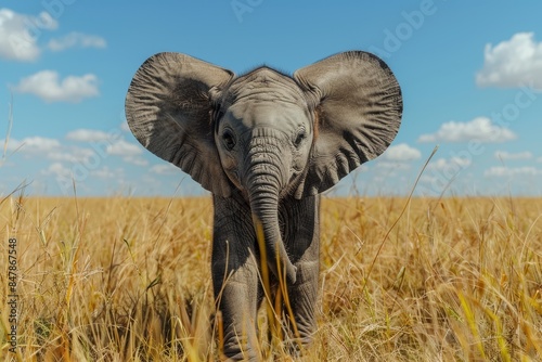 Baby Elephant: A small, chubby baby elephant with large ears and a short trunk, standing on a grassy savanna under a clear blue sky.
