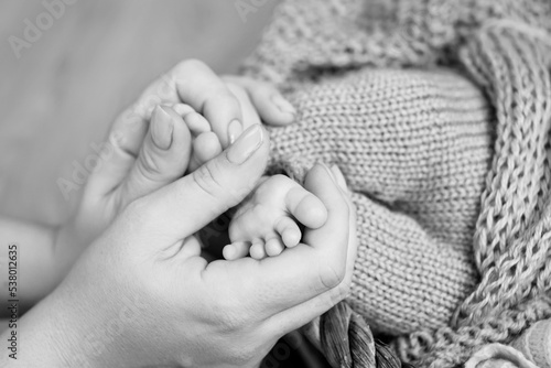 Baby feet in mother hands. Tiny Newborn Baby's feet on female Shaped hands closeup. Mom and her Child. Happy Family concept. Beautiful conceptual image of Maternity