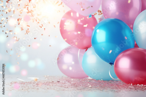 Baby gender reveal party: pink and blue balloons border with confetti and bokeh, festive