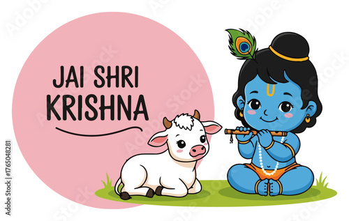 Baby Krishna with Cow Quote – Cute Blue Hindu God Playing Flute ‘Jai Shri Krishna’ Cartoon Vector Illustration