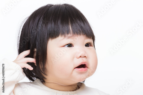asian, asia, baby, children, children, toddler, young, newborn, infant, skin, smooth, chinese, japanese, korean, little, cute, lovely, adorable, portrait, curious, curiosity, female, girl, scratch, head, hair, isolated, white, studio, open, mouth, sad, grieved, upset