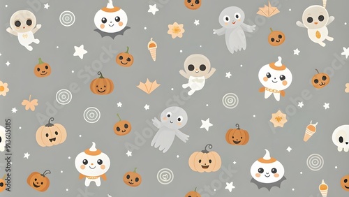 Baby seamless pattern Happy Halloween. Cute kid's background. Cartoon pumpkin, ghost, bat, skull, and spider. Modern Design for celebration, fabric, packaging