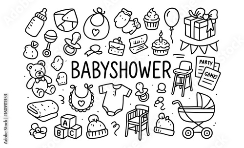 doodle, hand-drawn, baby shower, celebration, gift, toy, cake, black-and-white, cute, fun, party, pacifier, pushchair, teddy bear, bib, cupcake, present, hat, block, balloon, game, bottle, childcare center, children, whimsical, playful, festive, invitation, birthday, decoration