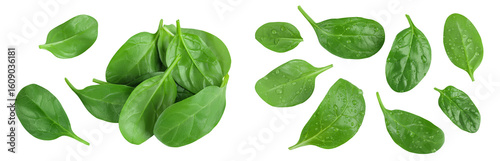 Baby spinach leaves isolated on white background. Top view. Flat lay