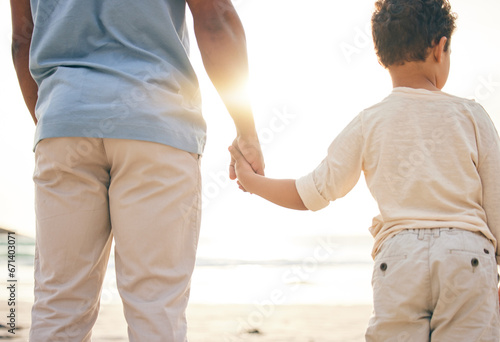 Back, beach and a father holding hands with his son as a family at sunset by the ocean or sea together. Children, love and a boy with his dad on a coast in nature while on summer vacation or holiday