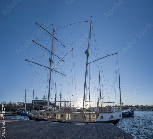 Back light view with rigs of winter closed old sailing boats a sunny winter day in Stockholm