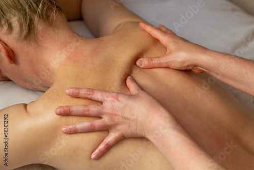 Back massage for a woman. Healing, medical and relaxing massage. Woman having massage of body in the spa salon. Beauty treatment concept.