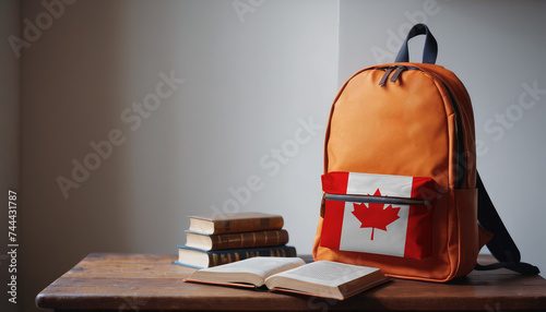 Back to school and happy time! Pile of books and backpack with Canada flag on the desk at the elementary school.