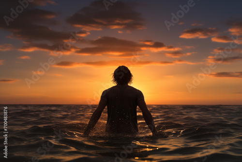 man, ocean, evening light, water reflection, sun setting, backview, relaxation, sea breeze