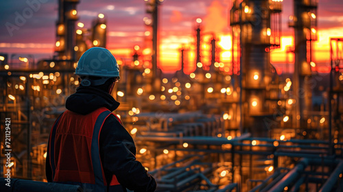 Back view of an engineer in safety gear overlooking the illuminated industrial plant facilities during the evening shift.