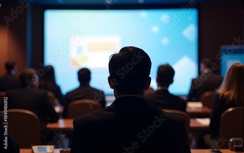 Back view of audience in the conference hall or seminar meeting with large media screen showing video presentation, business and education concept. High quality