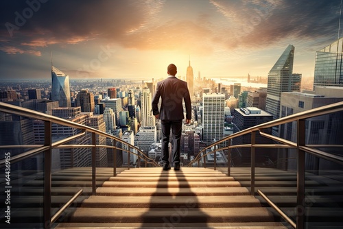 Back view of businessman walking up stairs on city background. Career and success concept