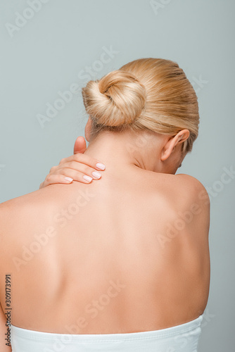 back view of girl touching neck isolated on grey