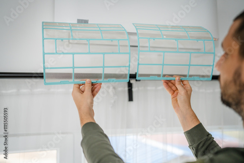 man, air, condition, clean, conditioner, filter, repair, service, unknown, arm, backview, maintenance, ventilator, house, men at work, technician, cold, fix, temperature, dust, hand, electric, home, system, indoor, electrician, machine, appliance, equipment, racked, hold, 1, male, caucasian, copy space, coil, cleaner, conditioning, cool, dirty, dusty, fixing, hot, installation, installing, purifier, remove, replace