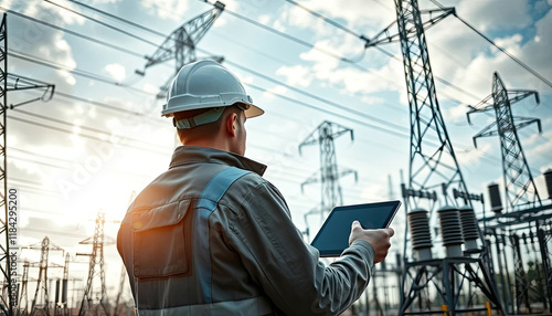 Back view of Manager Engineering in standard safety uniform working inspect the electricity high voltage pole